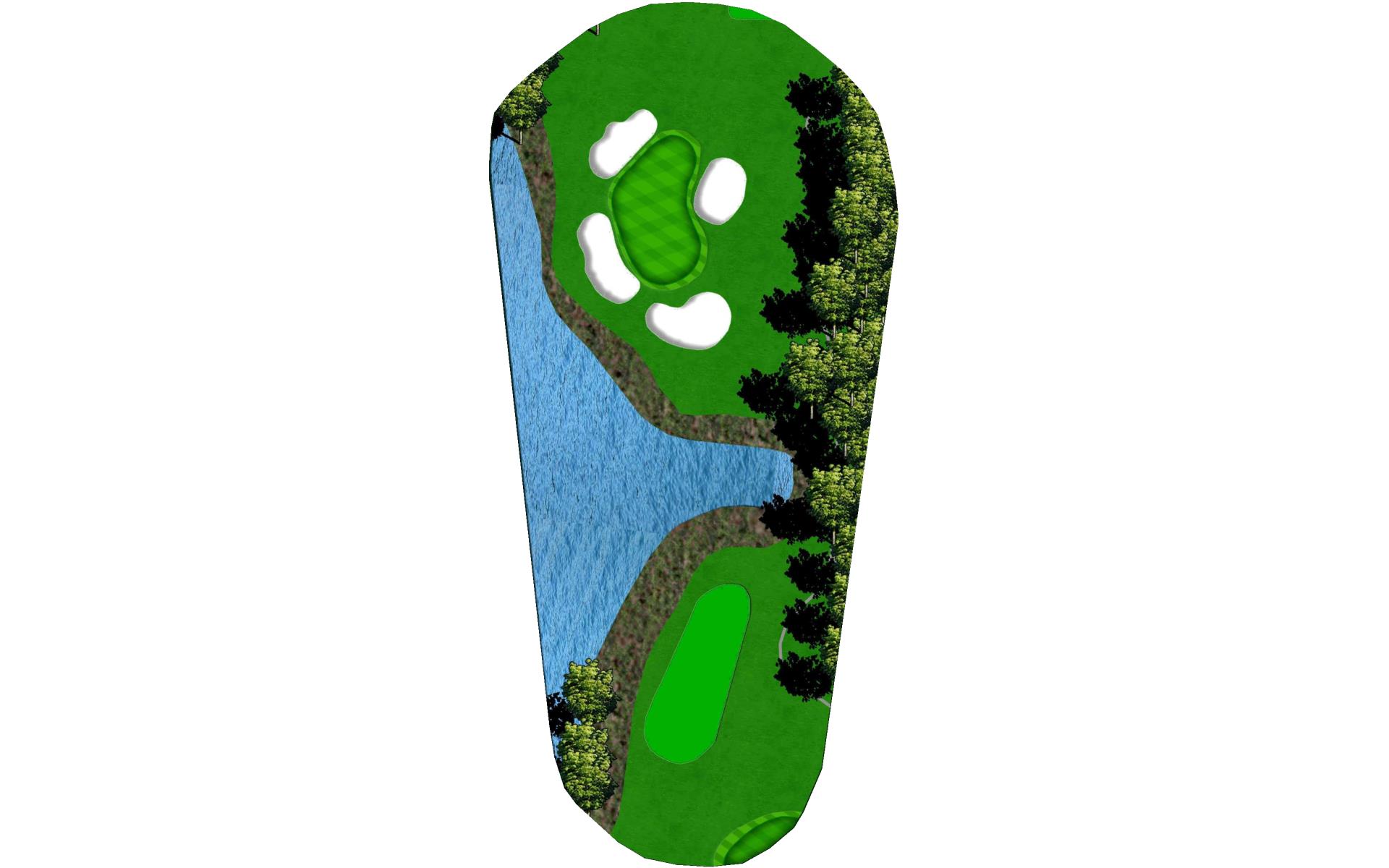 You can play it safe with a drive on the left side of the fairway or you can go over the pond to hit it right in the middle of the fairway. This hole requires a few good golf shots to score well. The green slopes right to left and has a back greenside bunker as well.